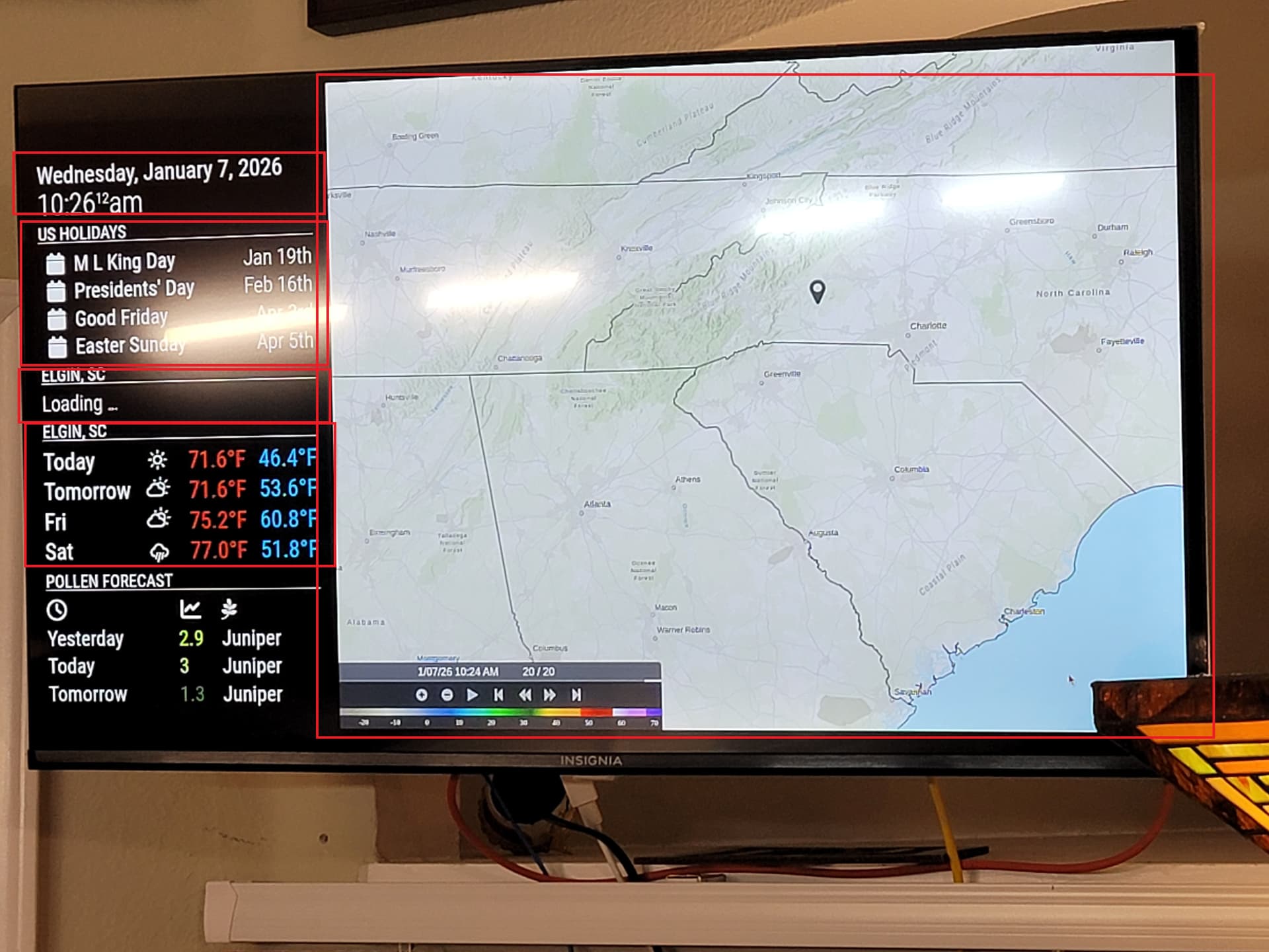 One of the modules is an an iFrame module which I have used in the previous magic mirrors to display a US National Weather Service live regional radar overlay. Here is a picture of that particular magic mirror. Each of the red boxes represents a discrete module. There are two weather modules, one configured for current the other is Forecast. The large module on the right side of display is the iframe with the radar image being displayed.