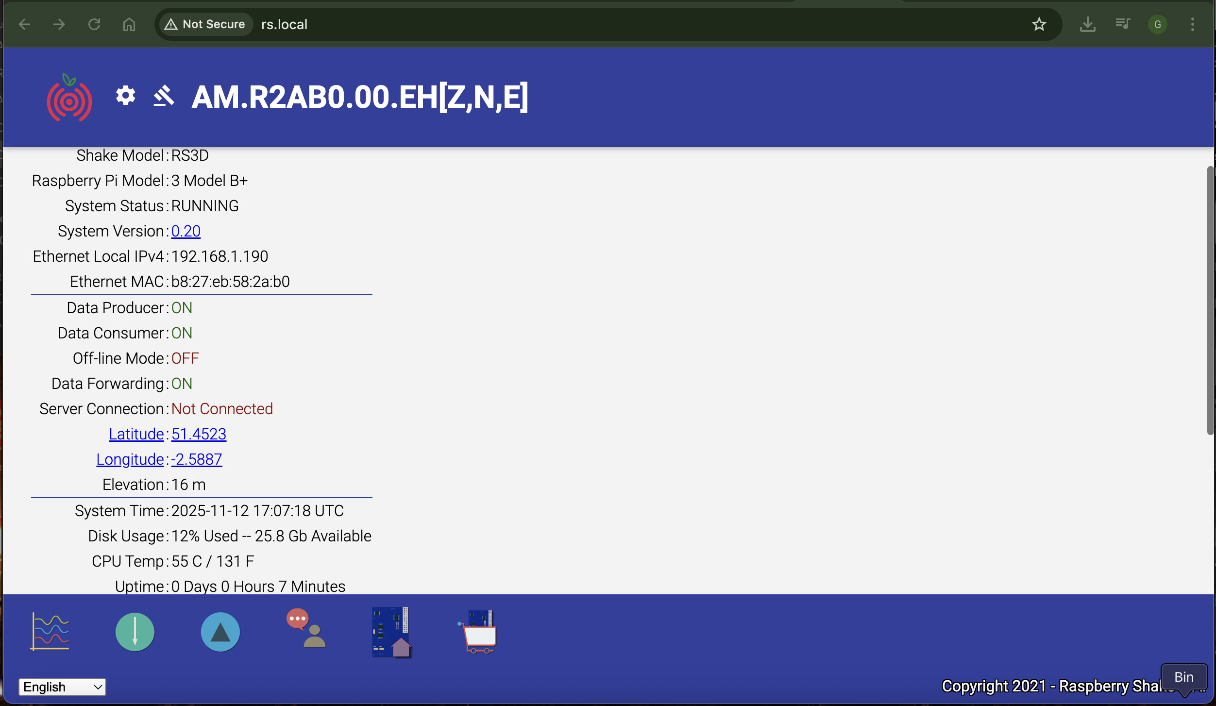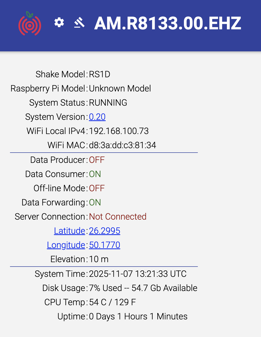 I followed the manual to run my Raspberry Shake: I connected the Shake to my home Wi-Fi network, accessed the interface and filled out all the required information and turned “Forward data” on.