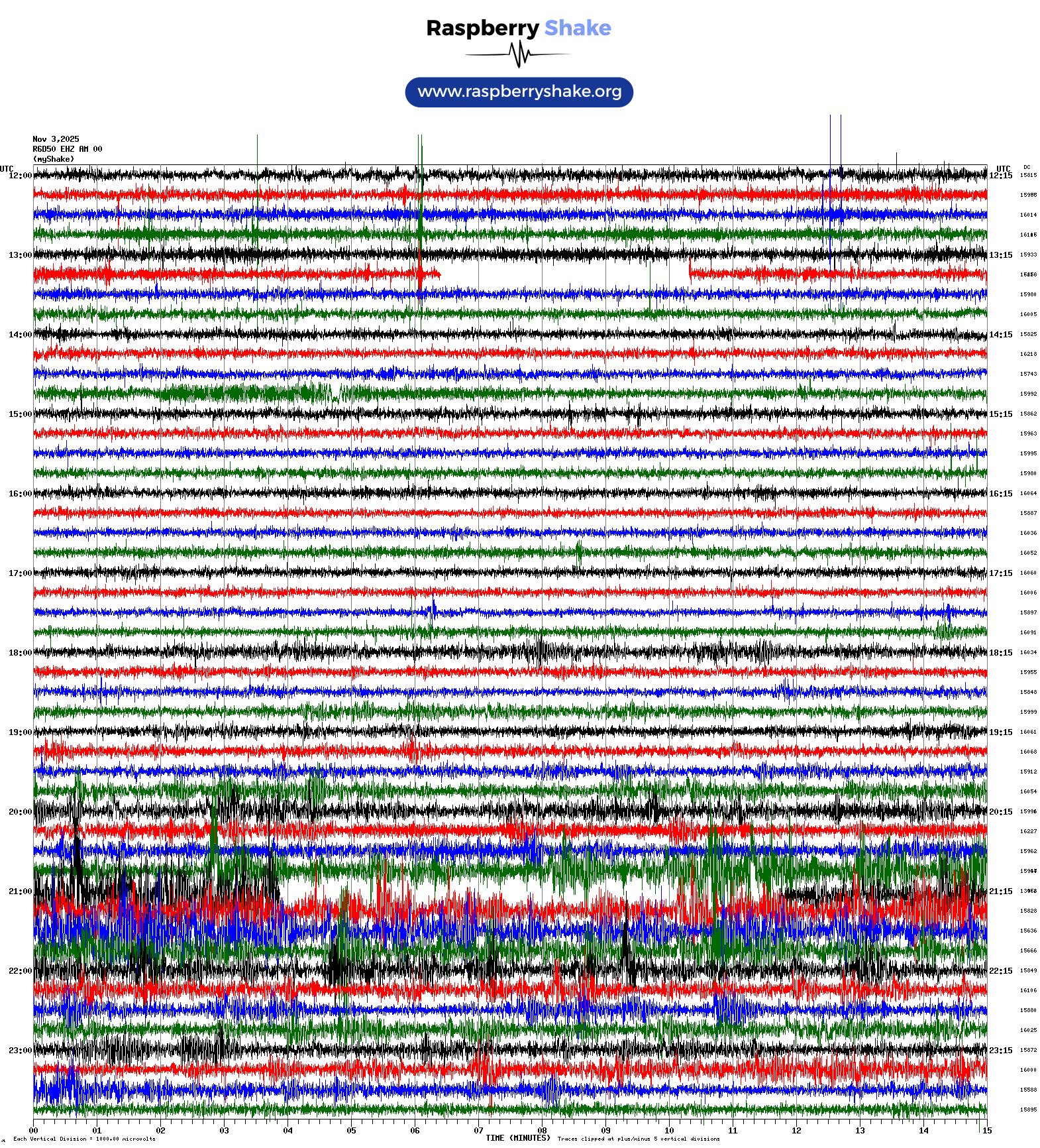 This is the helicorder from a typhoon Tino on Nov. 3rd. You can see the gaps where the power was out. The later gap, during the typhoon, was the delay until the building’s generator started, I switched over to generator power, and it rebooted.