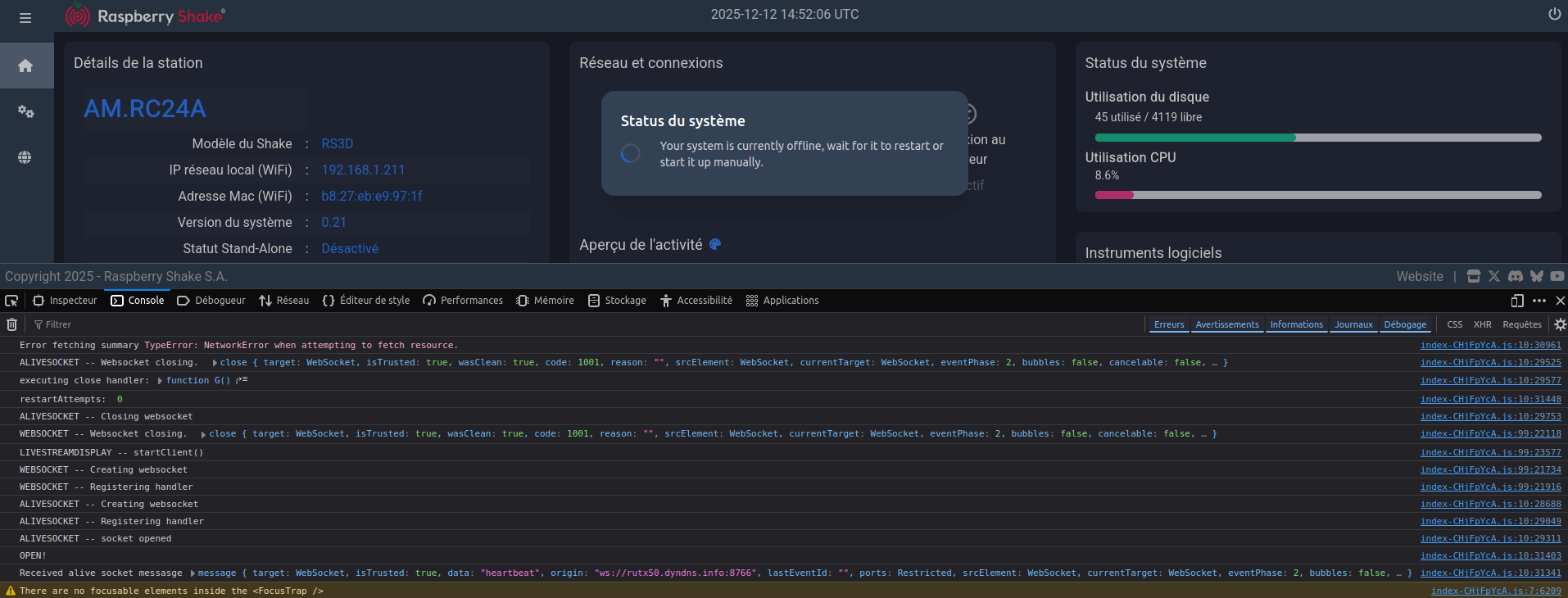 • But since few month, I saw on the notepad in the git archive, that we have to unzip all the content of “raspishake-release_V0.19” into the SD card, which we format in FAT32. Then during the boot the OS is installed.